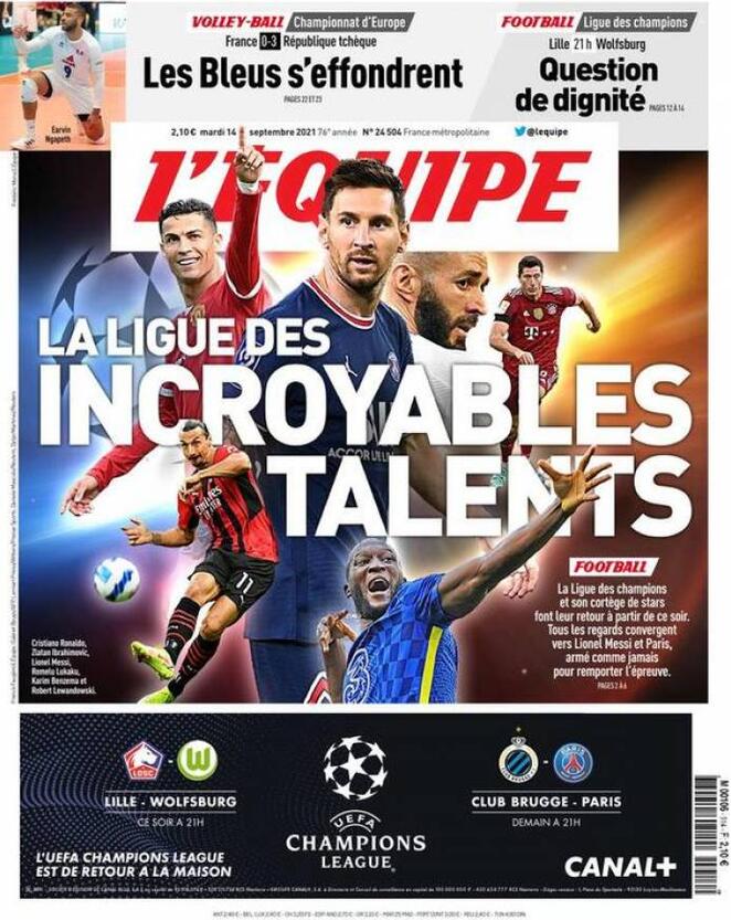 Ed a proposito di Messi, spostiamoci in Francia. L’Equipe fa un’anteprima generale della Champions League ai nastri di partenza: “Il trofeo degli incredibili talenti” titola il quotidiano francese che mette in prima pagina Lukaku del Chelsea, Ibrahimovic del Milan, Cristiano Ronaldo del Manchester United, Benzema del Real Madrid, Lewandowski del Bayern Monaco ed ovviamente Leo Messi del PSG. “La Champions League ed il suo corteo di campioni fanno il loro ritorno a partire da questa sera. Tutto sembra convergere verso Lionel Messi e Parigi, armati come non mai per vincere il trofeo”. Il PSG sarà impegnato domani contro il Club Brugge, mentre il Lille giocherà questa sera in casa contro il Wolsfburg: “Questione di dignità” titola l’Equipe sui campioni di Francia partiti malissimo in Ligue 1.