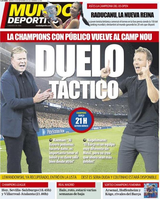Restando in Spagna, anche il Mundo Deportivo si concentra sulla sfida Barcellona-Bayern e lo fa mettendo a confronto Koeman e Nagelsmann e le loro dichiarazioni pre-match: “Duelo Tactico”. “Possiamo far male al Bayern – ha dichiarato Koeman, tecnico del Barcellona – E’ importante tenere il pallone e salire bene dalle retrovie”. Nagelsman, invece, non si fa ingannare dall’assenza di Messi: “Il Barcellona è una squadra completamente diversa senza Messi, ma non credo sia più debole”.