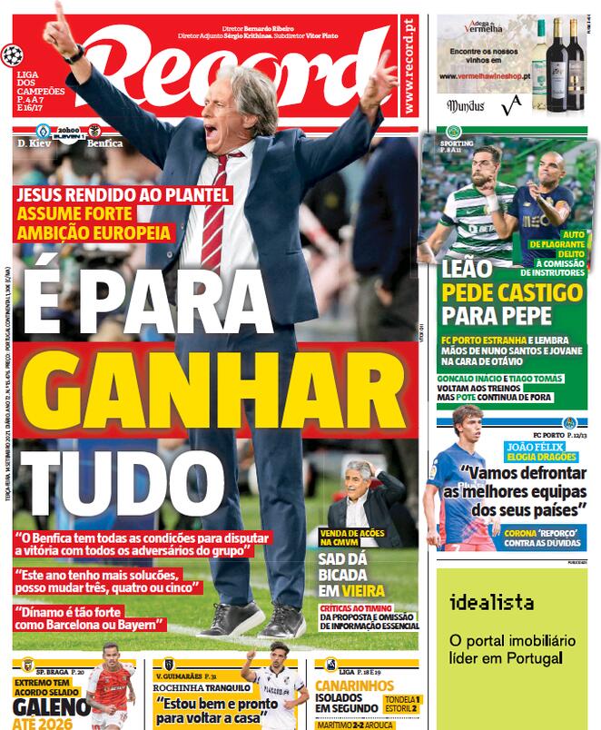 Chiudiamo il nostro primo viaggio internazionale con una tappa in Portogallo. Record presenta l’esordio di Benfica, Porto e Sporting Lisbona: “Possiamo vincerle tutte – ha dichiarato Jorge Jesus, tecnico del Benfica – Abbiamo tutte le possibilità di ottenere la vittoria contro tutte le avversarie del girone. Quest’anno abbiamo più soluzioni di gioco. La Dinamo Kiev è forte quanto il Barcellona o il Bayern Monaco”. Il Benfica esordirà appunto contro la Dinamo Kiev, mentre lo Sporting Lisbona e Porto giocheranno domani contro Ajax ed Atletico Madrid.