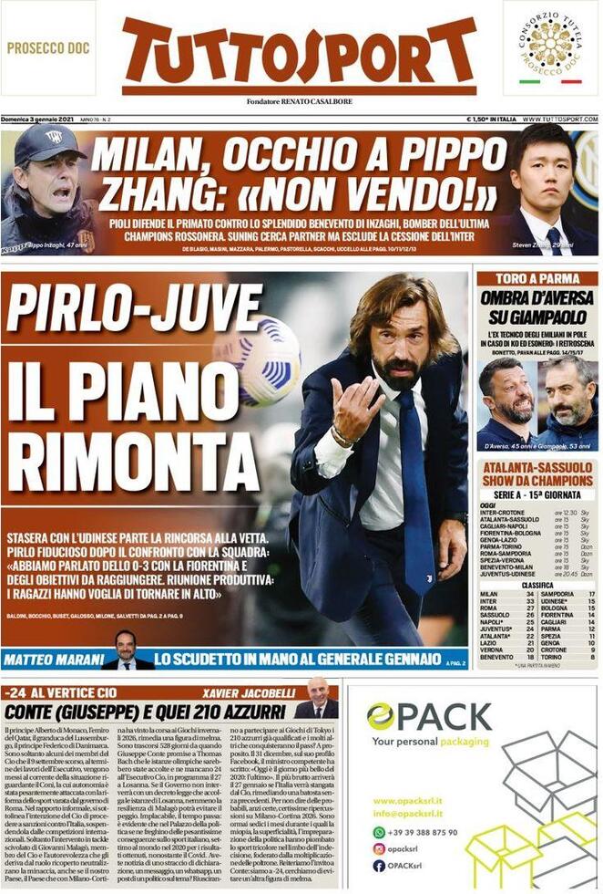 Per Tuttosport l’apertura è tutta per la Juventus: “Pirlo-Juve, il piano rimonta. Stasera con l’Udinese parte la rincorsa alla vetta. Pirlo fiducioso dopo il confronto con la squadra“. In taglio alto si parla di Milan ed Inter: “Milan, occhio a Pippo. Zhang: ‘Non vendo'”. Di spalla, infine, si parla del Torino (“Ombra D’Aversa su Giampaolo”) e di “Atalanta-Sassuolo show da Champions”.