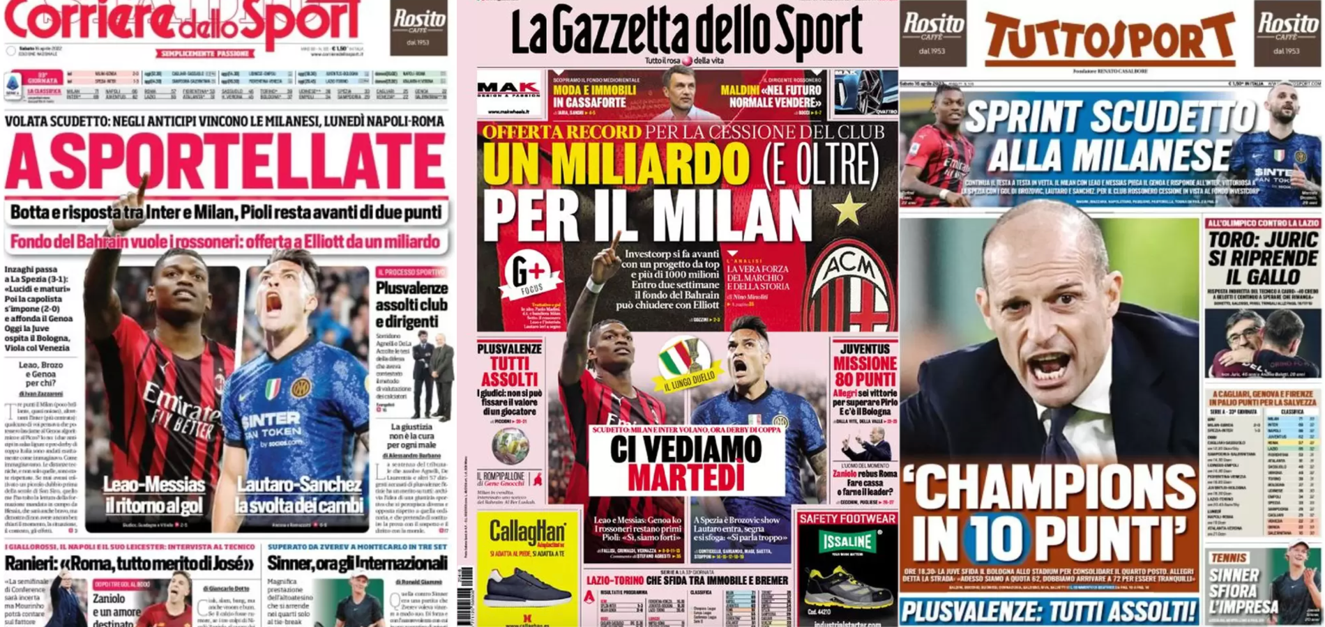 Buongiorno a tutti dalla redazione di CIP – Calcio in Pillole, che vi porta, come ogni mattina, in prima pagina! Alla scoperta delle aperture dei principali quotidiani sportivi in edicola oggi, sabato 16 aprile 2022. La prima pagina de La Gazzetta dello Sport La Gazzetta dello Sport apre con l’offerta record per la cessione del club: […]