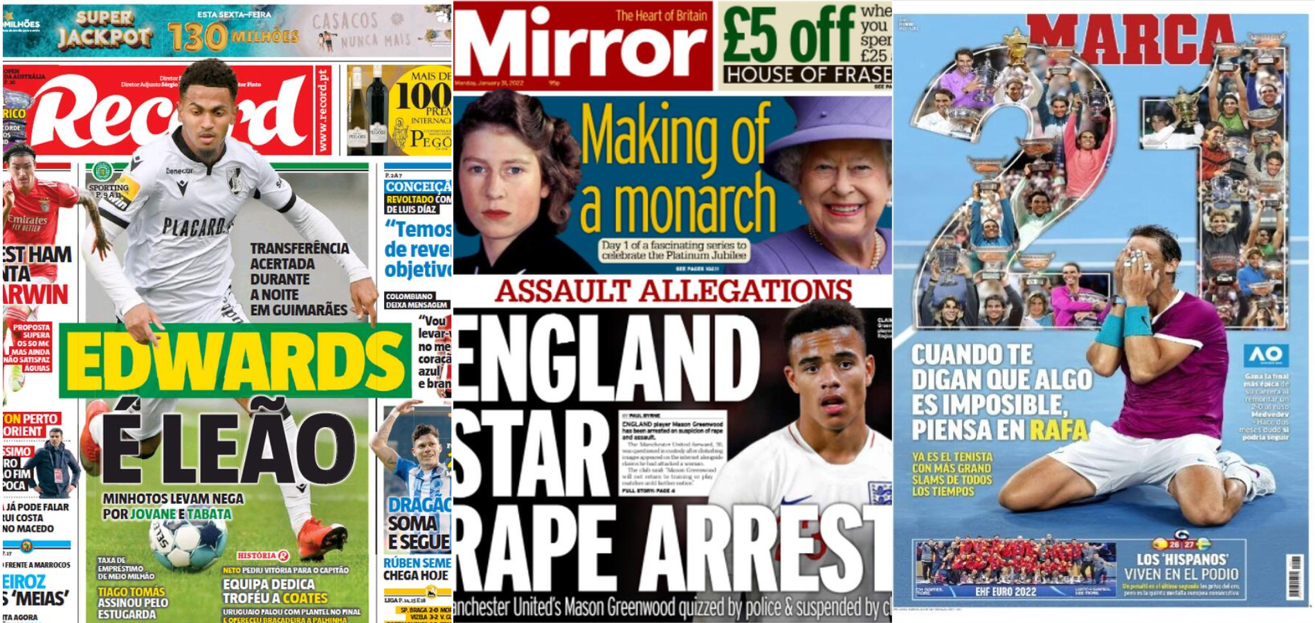 Buongiorno a tutti dalla redazione di CIP – Calcio in Pillole, che vi porta in prima pagina nei giornali sportivi esteri di oggi, lunedì 31 gennaio 2022. 🇬🇧 La prima pagina del Daily Mirror In Gran Bretagna, il Daily Mirror apre con le accuse di aggressione per il classe 2001. “Arresto per stupro per la stella dell’Inghilterra“, […]