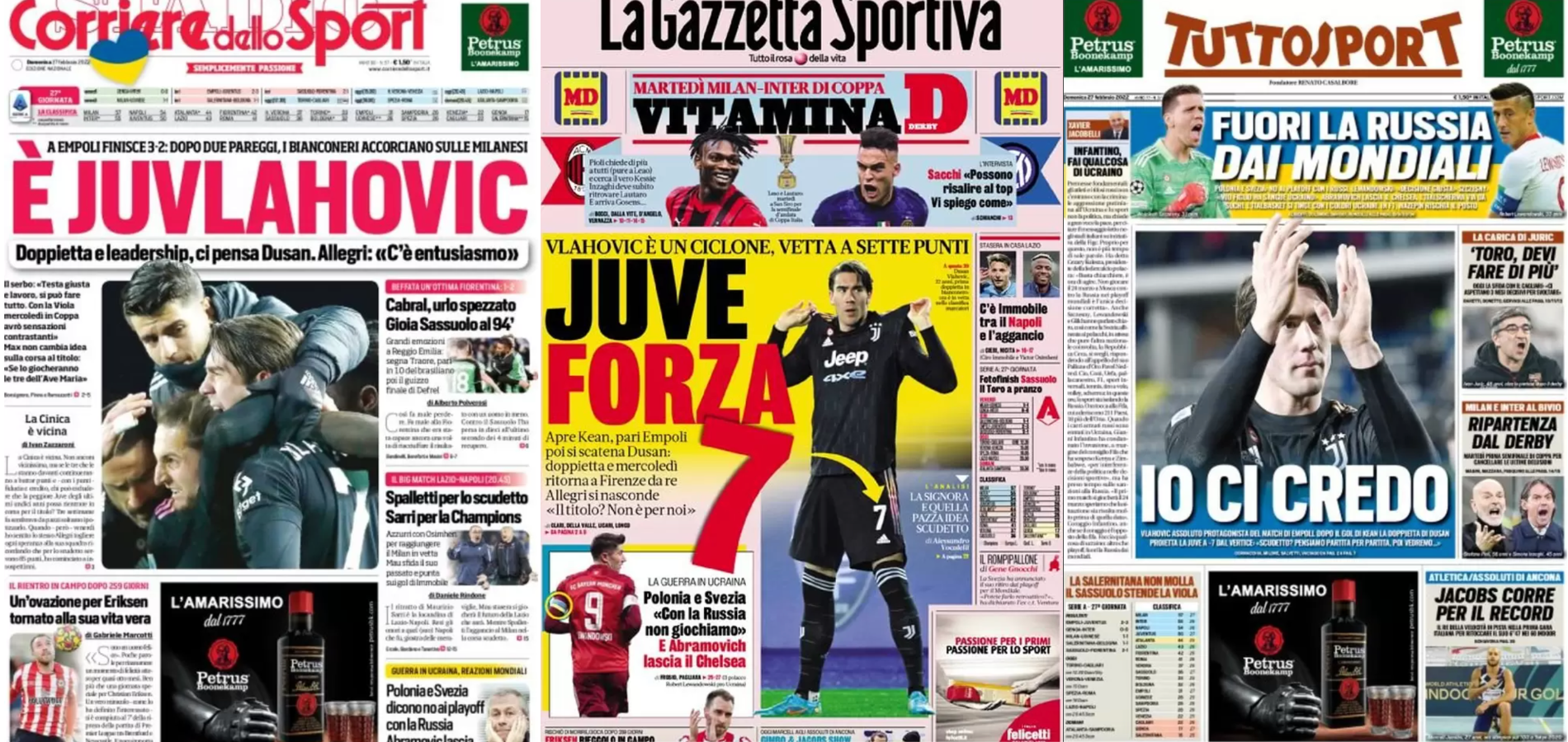 Buongiorno a tutti dalla redazione di CIP – Calcio in Pillole, che vi porta, come ogni mattina, in prima pagina! Alla scoperta delle aperture dei principali quotidiani sportivi in edicola oggi, domenica 27 febbraio 2022. La prima pagina de La Gazzetta dello Sport La Gazzetta dello Sport apre con i bianconeri: “Juve forza 7“, “Vlahovic è […]