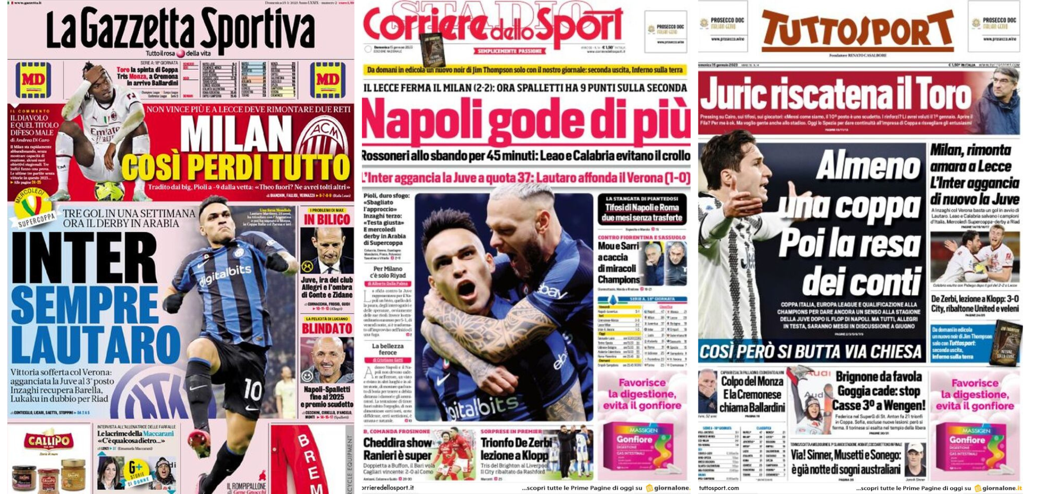 Buongiorno a tutti dalla redazione di CIP – Calcio in Pillole, che vi porta, come ogni mattina, in prima pagina! Alla scoperta delle aperture dei principali quotidiani sportivi in edicola oggi, Domenica 15 Gennaio 2023. La prima pagina de La Gazzetta dello Sport La Gazzetta dello Sport apre con la vittoria dei nerazzurri:“Inter sempre Lautaro”, “Tre […]